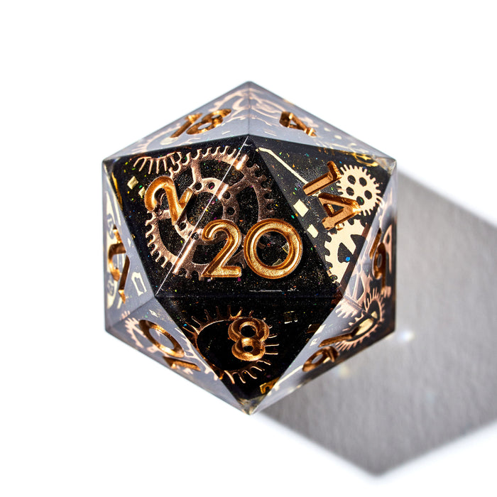 The Borrowed Time 7-Piece Iconic Set features a void black resin base with exquisite cogwheel designs on each face and matching copper inked numbers. A set for those DnD players who love to mess with the continuity.