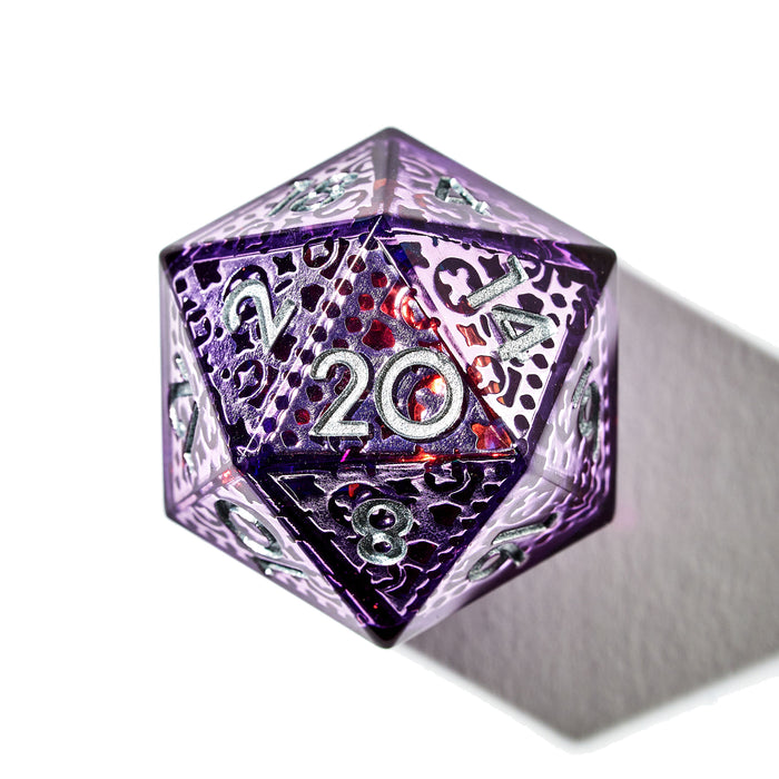 The Daughter of Darkness 7-Piece Iconic DnD dice set is inspired by a certain goth coded, cleric. This dark set features a shadowy purple inlay with intricate details on every face.