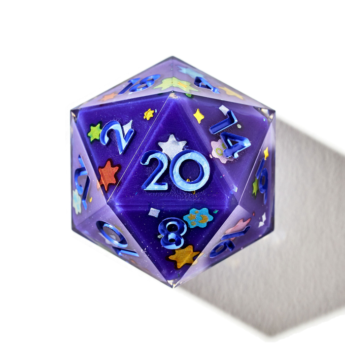 Meteor Shower is our 7-Piece Iconic set referencing the famous Japanese candies shaped like shooting stars. Featuring a galaxy purple base, light blue inked numbers, and the recognizable konpeitō candy designs on each face.