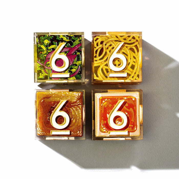 This set is just souper! While this Ramen 4-Piece Iconic D6 set may look delicious, don't drop them into your broth base! With one die sporting classic ramen noodle designs, another bursting with vibrant green onions, a third simmering with rich broth, and the last one perfectly seasoned with savory tare, you'll be ready to add a dash of culinary charm to any game night.