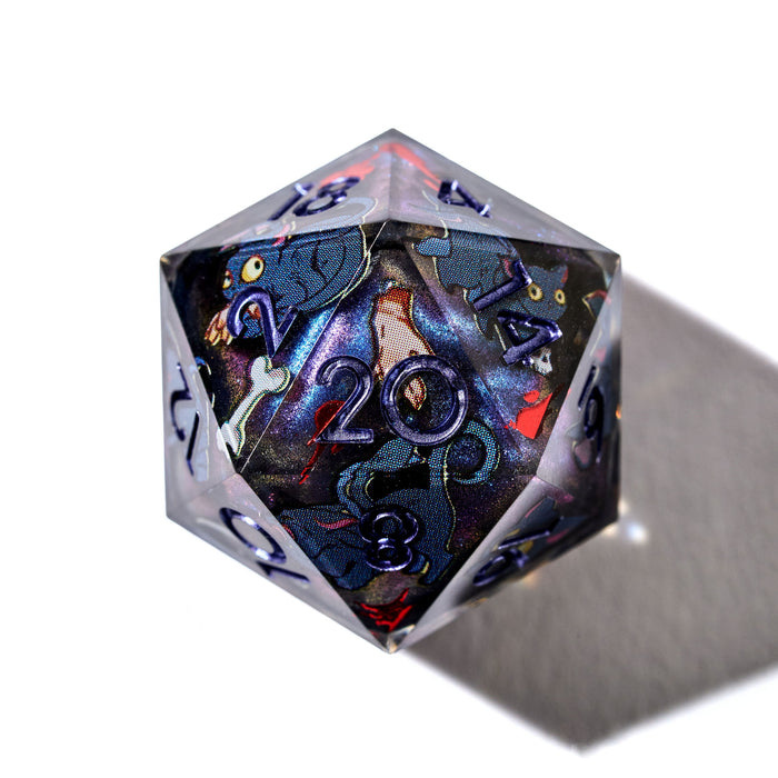 - Materials & Inclusions: Purple sparkling resin body, tentacle kitty designs on each face, and metallic purple inked numbers.