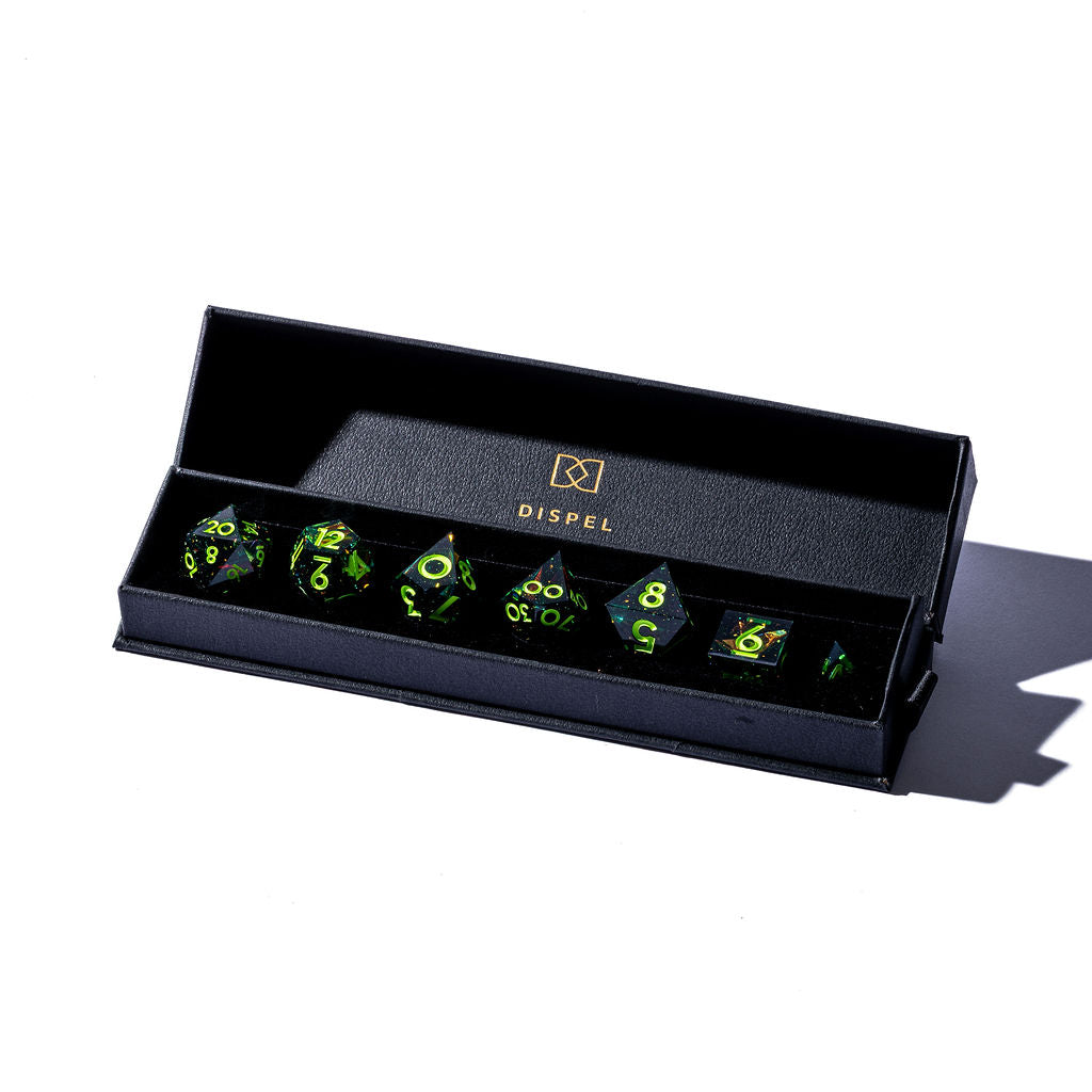 Walking among the turnings, one finds the world quiet and the self unanchored. Labyrinth 7-Piece Dice Set reflects the deep emerald of the hedges pressing in around you in the maze you initially entered for a bit of contemplation, and is inked in a matching neon green. Perhaps your rolls will show you the way out!
