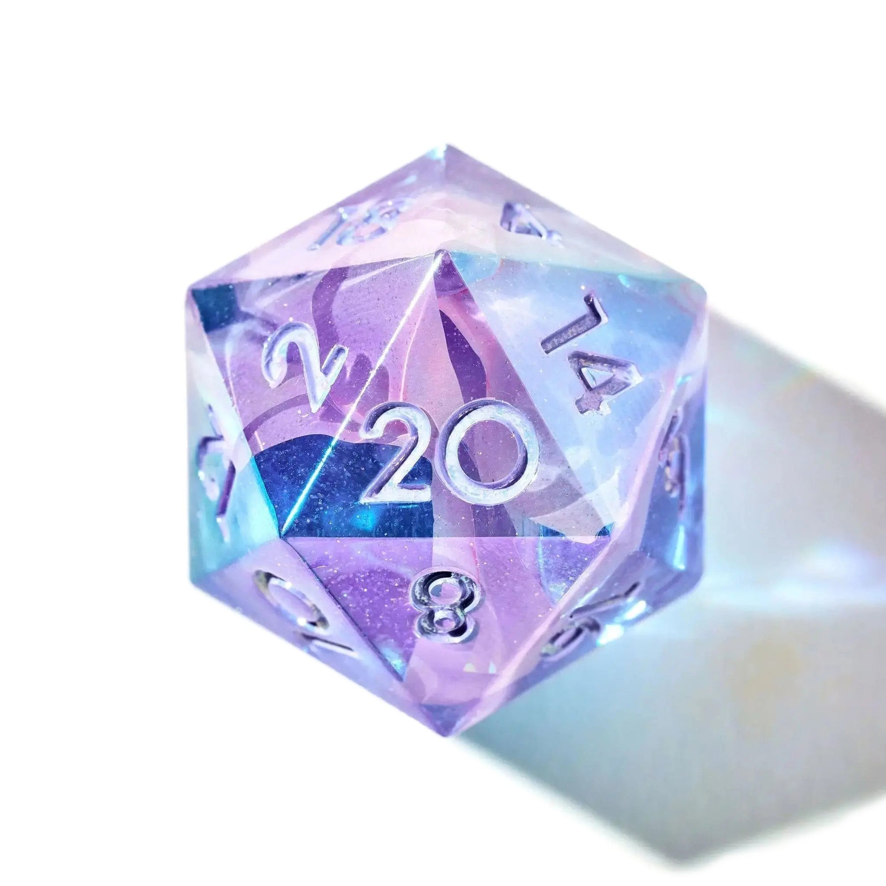 Crafted from pastel blue resin with swirls of pink and lavender, these gorgeous RPG dice are designed to evoke memories of dragons and butterfly wings.