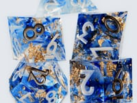 Designed to set the mood and stun your party, every artisanal die is made from hand-poured clear resin with dark blue and white swirls, gold flakes, and foil inclusions and finished with white and gold ink (for the high numbers.)