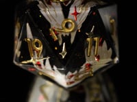 The Be Not Afraid 7-Piece Iconic Dice Set features a glittering black core featuring shimmering gold mica powder, and imagery inspired by biblically accurate angels and seraphim. Gold gilded feathered wings and crimson red foil eyes peer out at you from underneath metallic gold numbers. A perfect match for those playing fallen angels and Aasimar in their DnD campaigns.