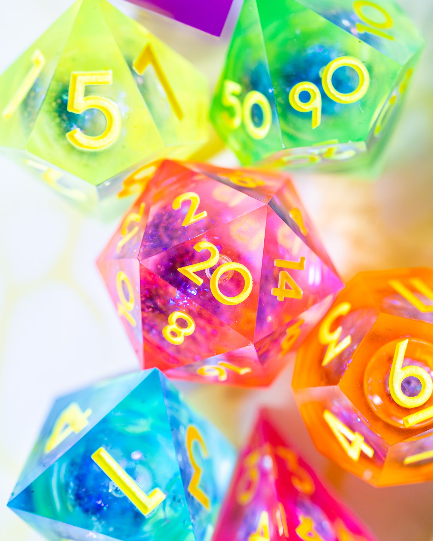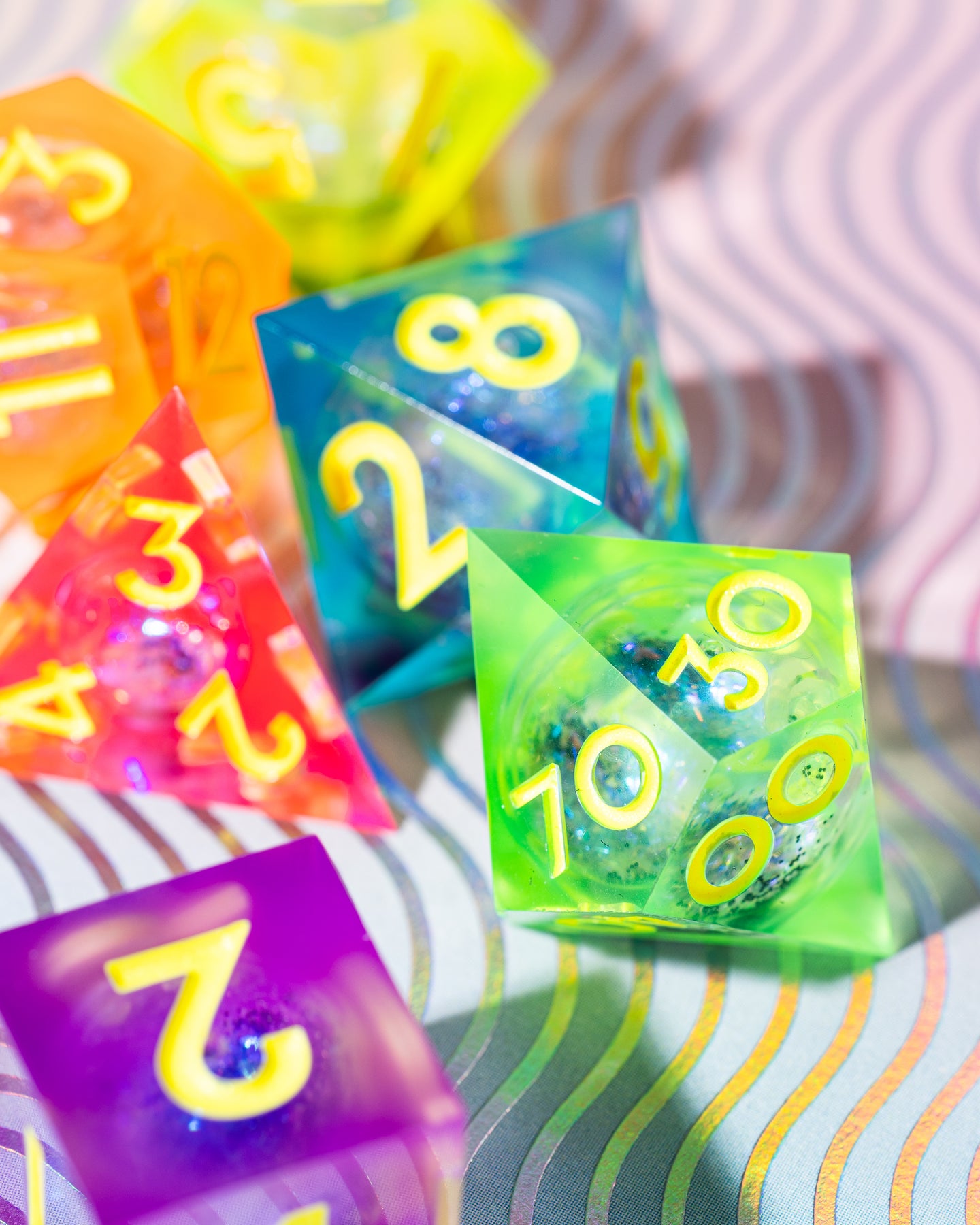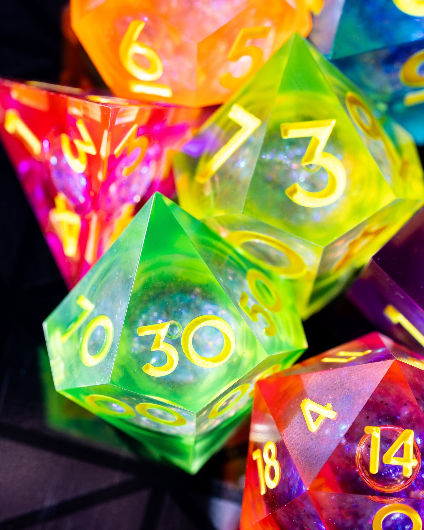 Materials & Inclusions: Multicolor resin shells (Green, Yellow, Orange, Red, Purple, Blue, and Magenta), with a glittering liquid core, topped with yellow inked numbers