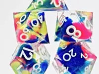 Inspired by the DnD 5e spell of the same name, our Color Spray dice are made from resin with swirls of blue, pink, and red. Combined with iridescent flakes and white numbering, these dice will surely put a spell on your party... or any other elves, goblins, ogres, or other creatures you may encounter.
