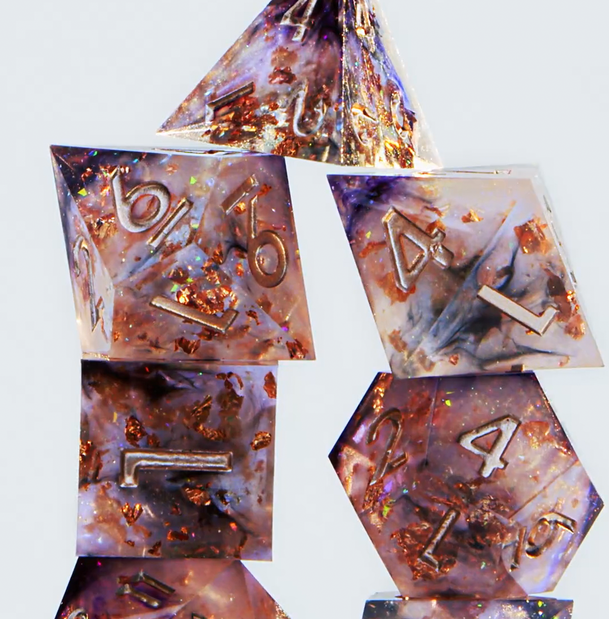 Every artisan set is hand-poured, so there may be slight differences in color and material suspension in the dice.