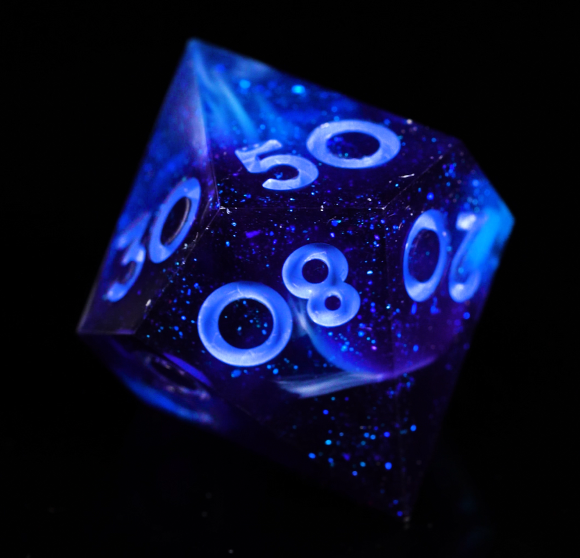 The Deep Blue Sea 7-Piece Polyhedral Dice set features a deep blue, glittery resin base with swirls of white to capture the feeling of the tumultuous abyss.