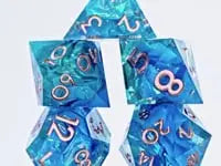 An inked 7-piece polyhedral dice set for tabletop roleplay gaming in Faewater. Made from clear teal resin with milky lavender, periwinkle swirls, aqua-colored mylar, and warm iridescent flakes, these dice will surely evoke memories of the Fae.