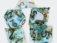 Conjure up a beautiful lakeside setting with our lovely blue dice aptly named Lagoon. These lush dice for DnD are hand-poured from aqua blue resin with warm mylar inclusions, iridescent flakes, and white numbering, making them one of a kind, so there may be very slight differences in color in each of the dice.