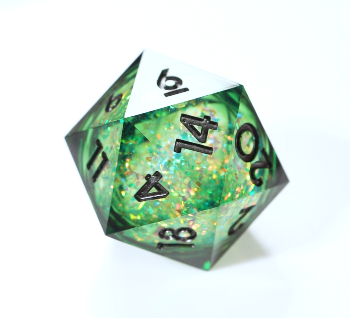 Sharp-edged construction allows for more randomized rolls when compared to traditional rounded-edge RPG dice.