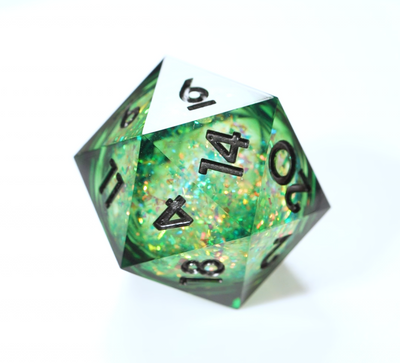 Materials: Smoky clear resin base, green glittery liquid core, and black inked numbers
