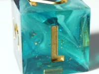 Inspired by the tragic ending of the timeless classic The Little Mermaid, Seafoam is a teal 7-Piece Standard Dice Set with white swirls painted in, gold foil, iridescent shimmer and antique gold numbers.