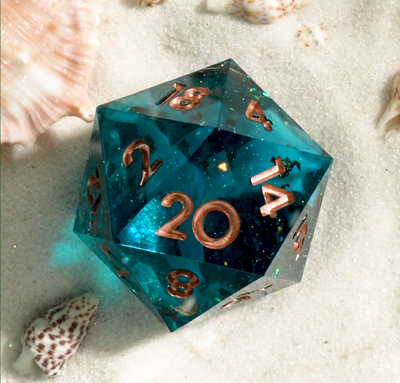 Behold these Seashore dice, each an echo of the ocean's most captivating hues. A breathtaking spectrum of teal, shifting from the sun-drenched turquoise of shallow lagoons, to the deeper blues of the oncoming swell, these gold flecked dice are inked in sand inspired rose gold. It's as if a pristine section of the coastline has been condensed and poured into these polyhedral forms, alive with the very waves of the sea.