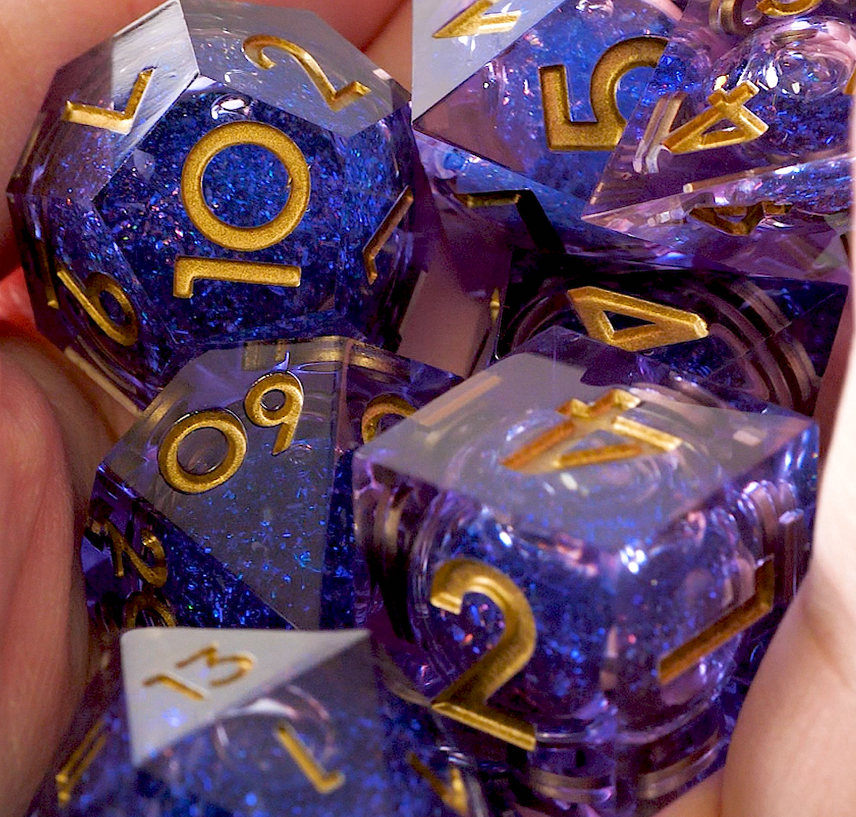 Featuring a gorgeous indigo shell with a shimmering liquid core, glitter inclusions, and gold ink, these dice will make you believe you can manipulate the fabric of reality with every roll.